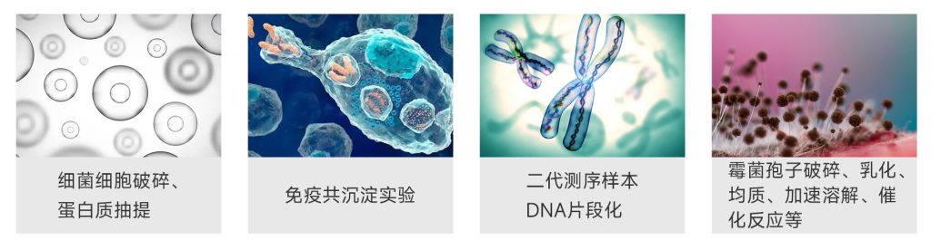 通過壓電轉換器,將電信號轉變為高頻聲波信號,產生數百萬的分子“空穴”,利用“空穴”在幾秒內變大、破裂產生的瞬時流體剪切力,通過等溫、非接觸的方式對樣本進行打斷、勻漿和混合。