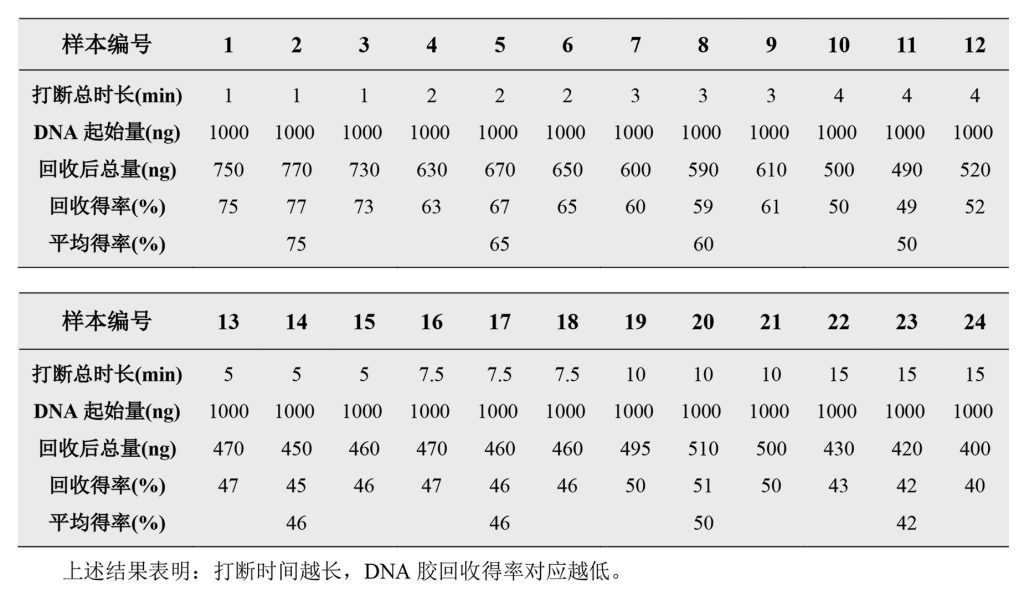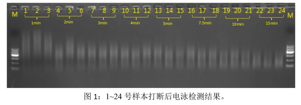 實驗結果表明:(1) 隨著打斷時間的增加,打斷片段的大小也隨之變小;(2) 相同打斷條件下,打斷效果的重復性和均一性良好。